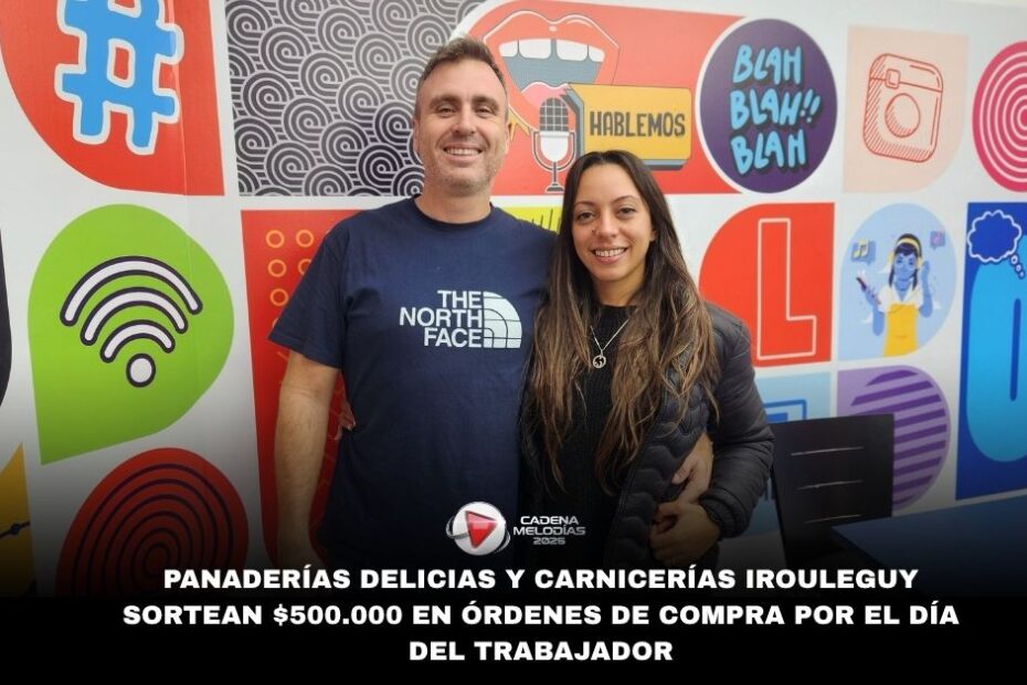 En una visita a los estudios de Cadena Melodías, Melisa Mieggi (Panaderías Delicias) e Ignacio Irouleguy (Carnicerías Irouleguy) confirmaron una serie de promociones y sorteos que buscan honrar el esfuerzo de los trabajadores argentinos. Con una inversión conjunta que supera el medio millón de pesos en premios, ambos comercios buscan fidelizar a sus clientes y celebrar el 1° de mayo de manera contundente.