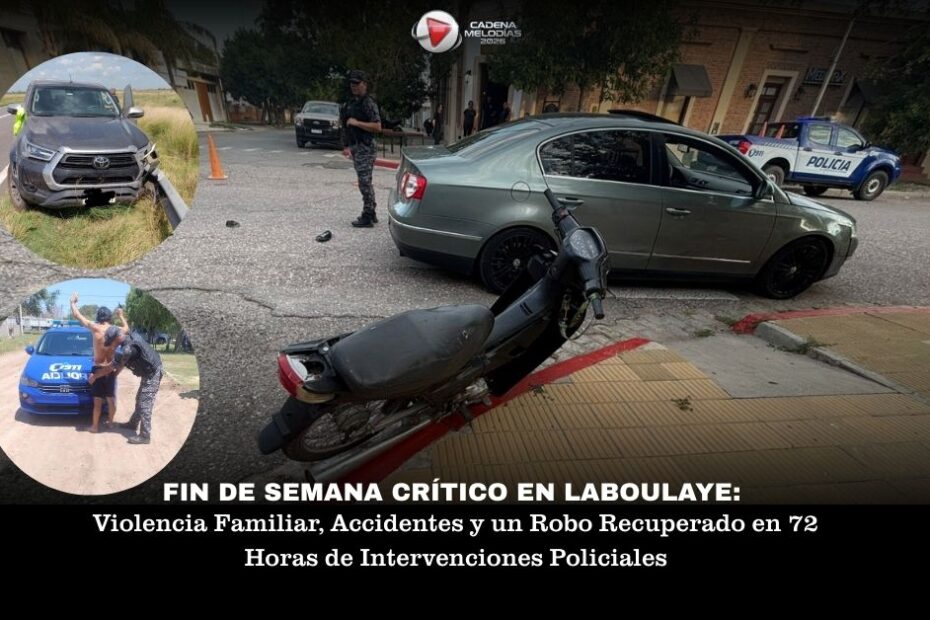 LABOULAYE, 03 de Febrero de 2026. – Un fin de semana con múltiples intervenciones policiales marcó la agenda de seguridad en la ciudad de Laboulaye. En un lapso de apenas cuatro días, las fuerzas de seguridad debieron actuar frente a casos de violencia intrafamiliar, siniestros viales con consecuencias variables y en una exitosa investigación que permitió recuperar un rodado hurtado. A continuación, el detalle minucioso de cada procedimiento.
