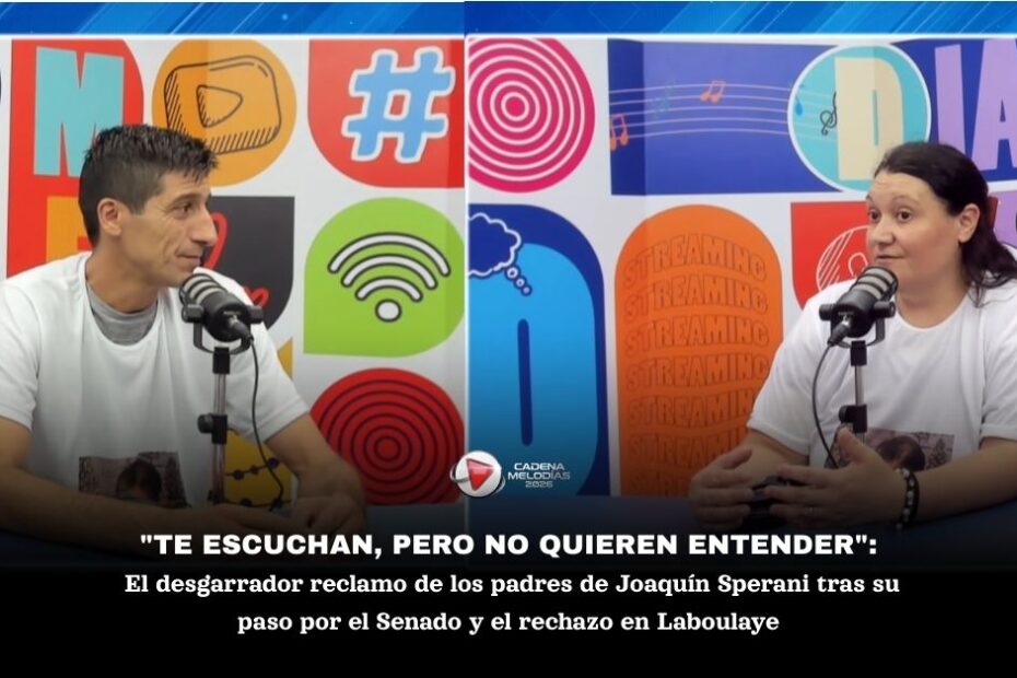 Tras ser recibidos en la comisión de senadores que debate la ley de baja de imputabilidad, Mariela Flores y Martín Sperani, padres de Joaquín, el niño asesinado en Laboulaye, visitaron los estudios de Cadena Melodías. Para ellos, la experiencia de participar en el Congreso fue agridulce. «Te produce ser escuchado, pero vimos reacciones de que no quieren entender. Siguen con la metodología de ‘no importa, son poquitos’ o ‘es un niño pobre'», expresó Martín Sperani con visible frustración.